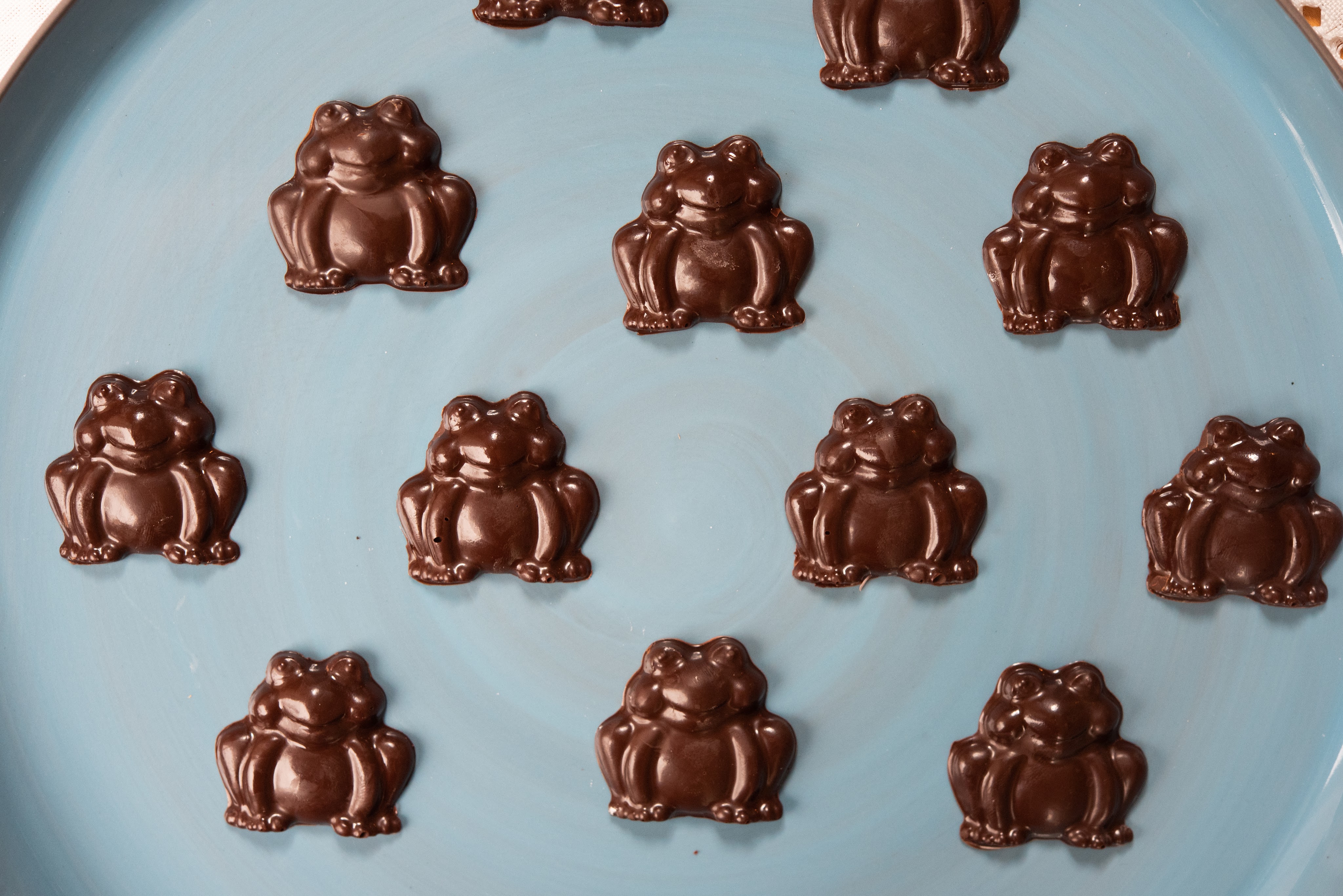 For these chocolate frogs, I used simple plastic frog moulds from Amazon and filled them with dark chocolate that I tempered. The tempering of chocolate is an extra step that helps it stay shiny and gives it that distinctive snap.